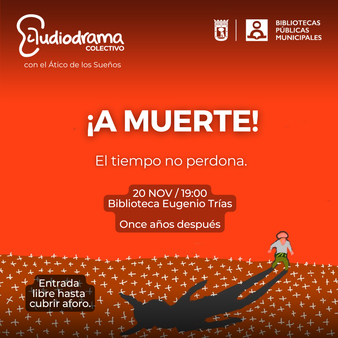 Jueves 20 de noviembre. Once años después de su presentación en la Biblioteca Eugenio Trías, un 20 de noviembre de 2014, Audiodrama Colectivo de función. ¡A MUERTE!